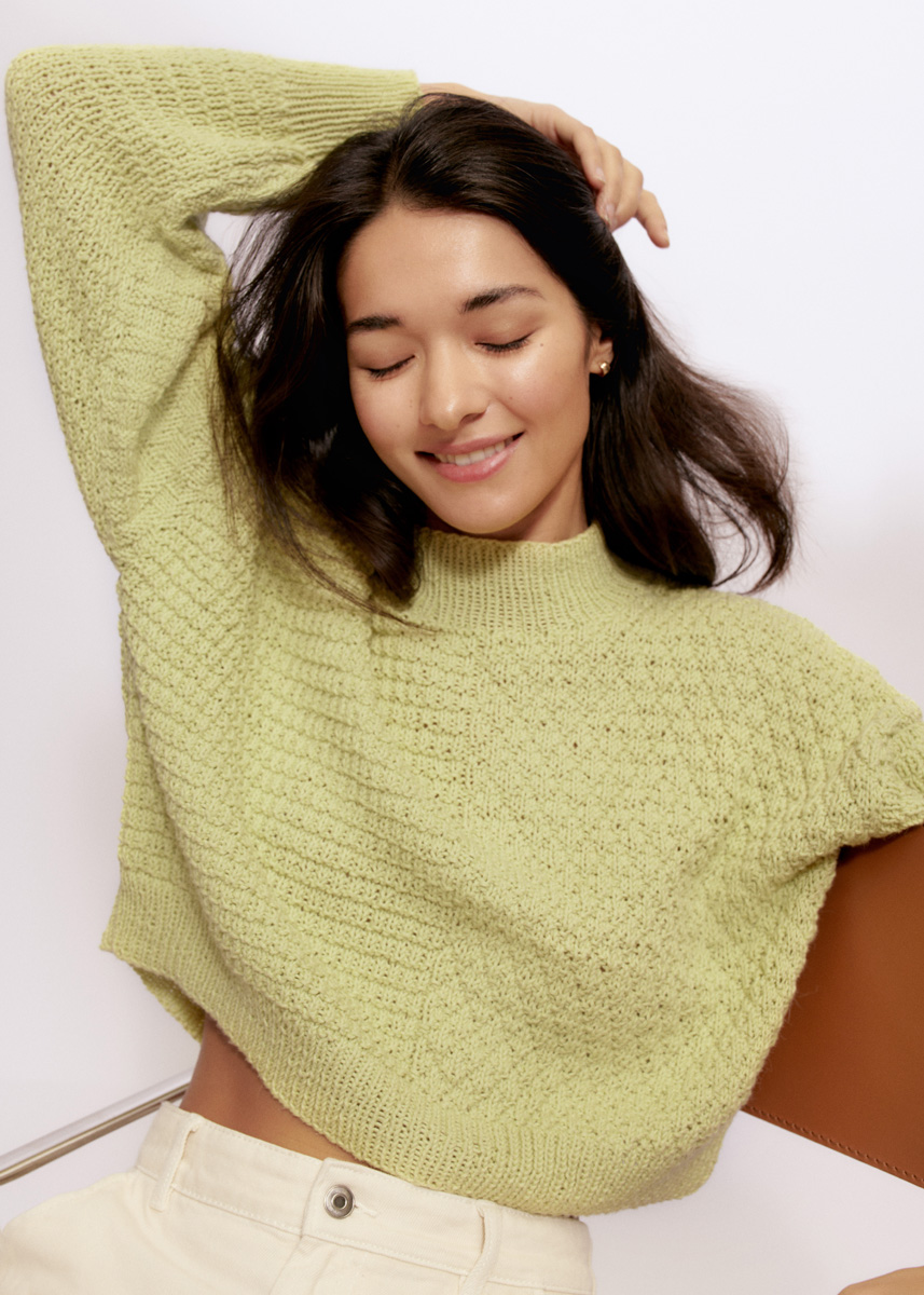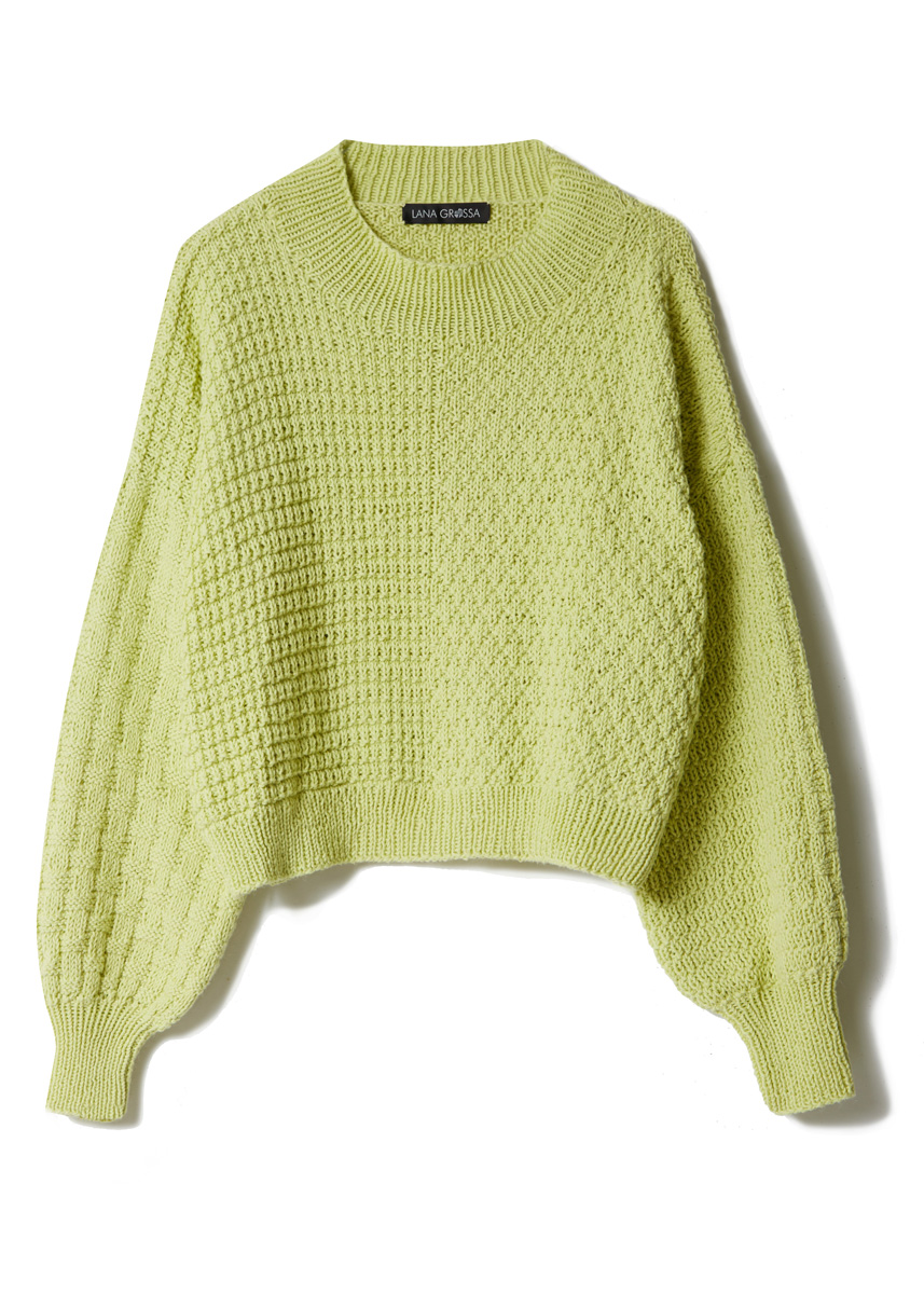 Lana Grossa Brigitte No. 4 (80% Baumwolle, 20% Alpaka (Baby), Lauflänge 110 m/50 g), 500 (550 – 600) g Grüngelb (Fb 30); Stricknadeln Nr. 3 und 4, 1 Rundstricknadel Nr. 3, 40 cm lang.