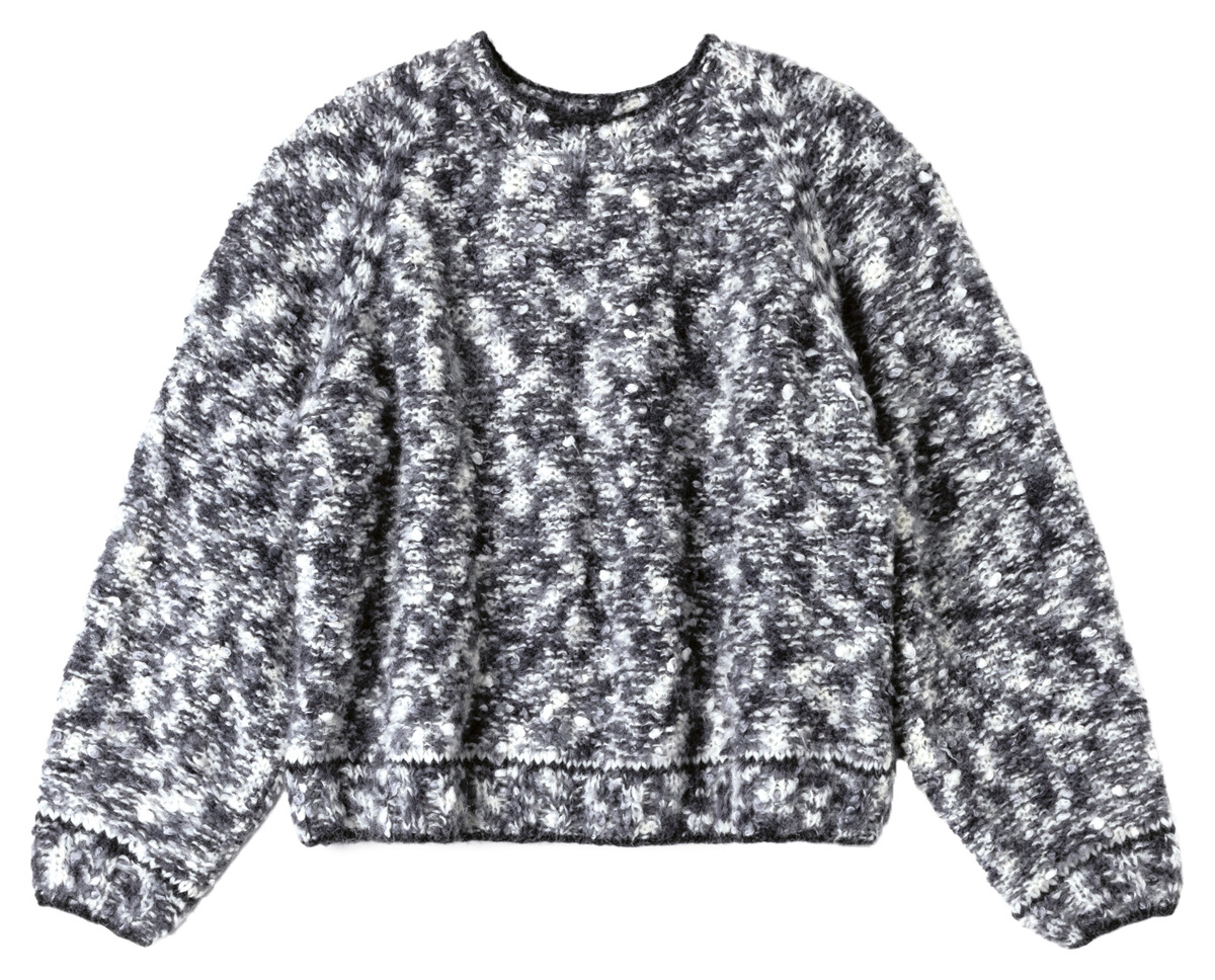 Lana Grossa Lala Berlin Brushy Print (40% Schurwolle (Merino), 36% Mohair (Superkid), 13% Polyamid, 11% Baumwolle, Lauflänge 115 m/50 g), 350 (400 – 450) g Weiß/Grau/Schwarz (Fb 207) und Lana Grossa Lala Berlin Lovely Cotton (75% Schurwolle (Merino superfine), 25% Baumwolle, Lauflänge 90 m/50 g), 50 g Rohweiß (Fb 33) und 50 g Anthrazit (Fb 8), Stricknadeln Nr. 4 und 6, sowie 1 Rundstricknadel Nr. 6, 40 cm lang.
