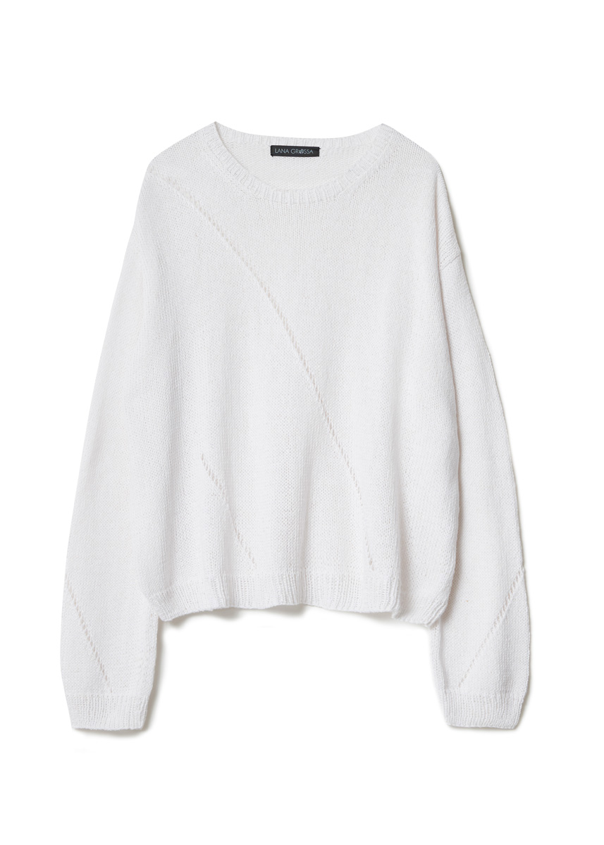 Hier haben wir das Top von der linken Seite durch lange Ärmel ergänzt. Auch das Garn ist das gleiche, nur strahlt es diesmal in zeitlosem Weiß. Anleitung bis Größe 48/50.