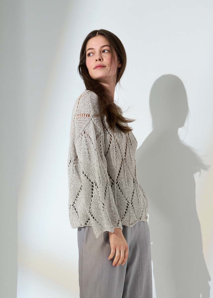 Der doppelfädig gestrickte Pullover im Ajourmuster bringt den Frühling direkt mit.