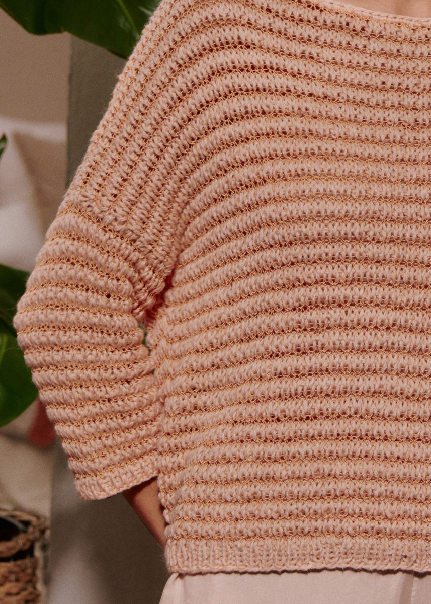Für den Rundhals- Pullover mit markanten Querrippen wurden zwei unterschiedlich dicke Garne abwechselnd zu Streifen verstrickt. Die simple Form mit gerade angestrickten Ärmeln macht das Modell zum Einsteiger-Piece.