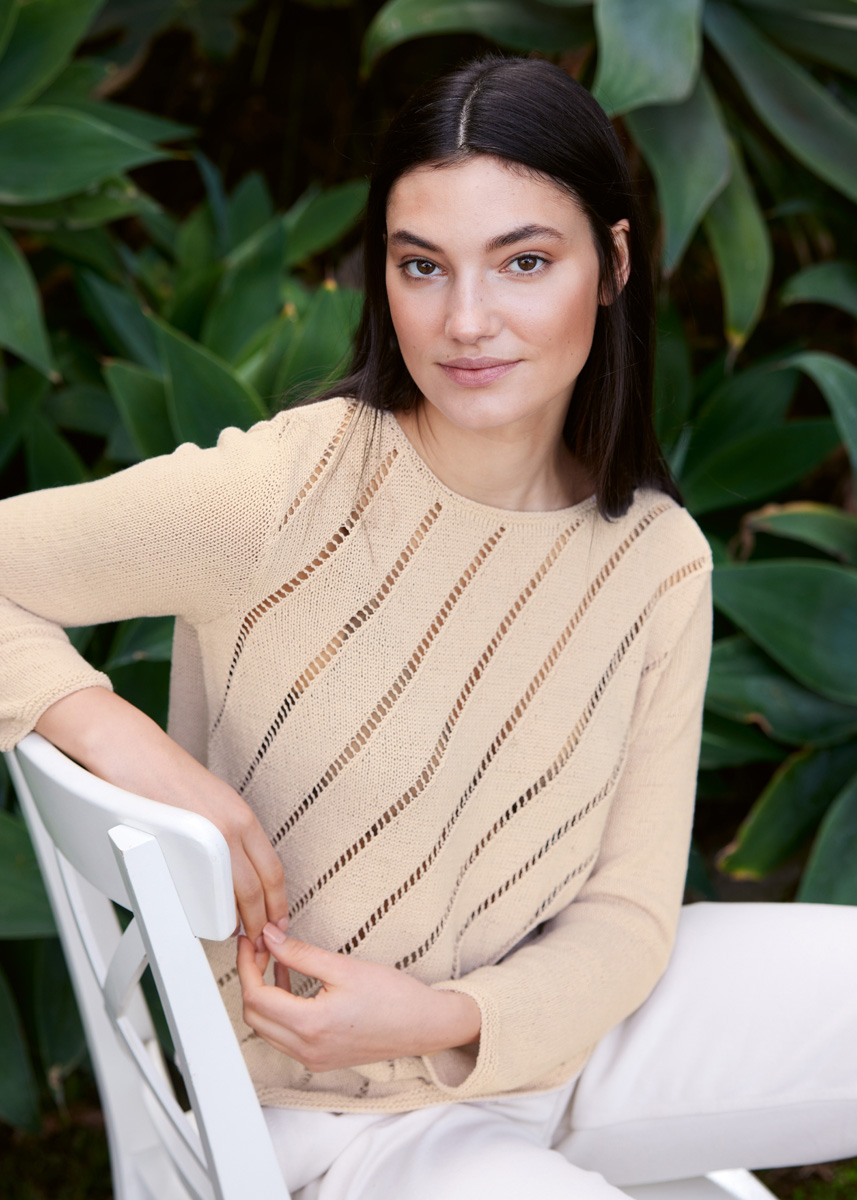 Lana Grossa Capri (55% Baumwolle, 30% Polyamid, 15% Seide, Lauflänge 150 m/50 g), 450 (500 – 500) g Hellelfenbein (Fb 38); Stricknadeln Nr. 2,5 und 3, 1 Rundstricknadel Nr. 2,5, 40 cm lang.
