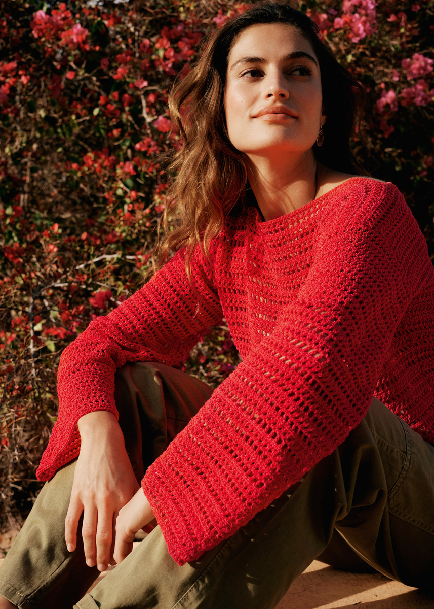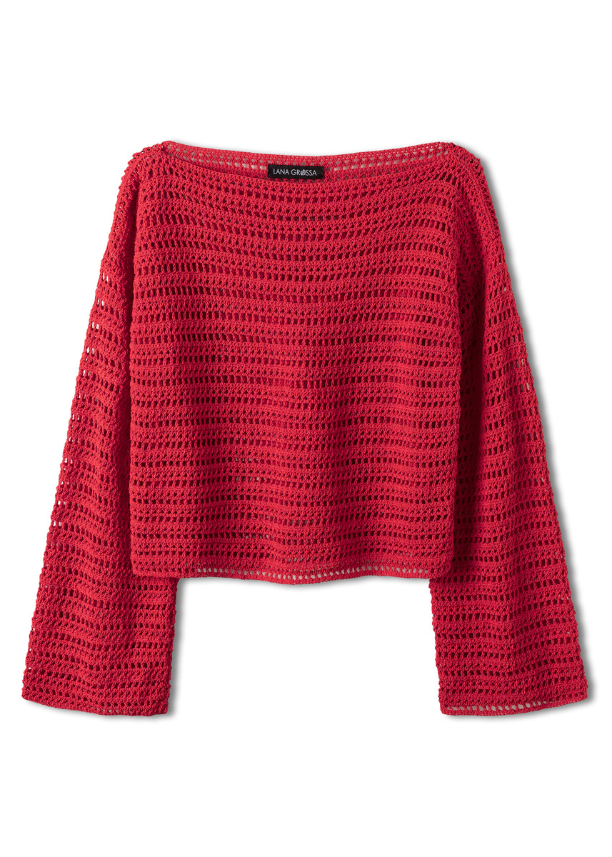 Lana Grossa-Qualität „Capri” (55 % Baumwolle, 30 % Polyamid, 15 % Seide, LL = ca. 150 m/50 g): ca. 500 (550 – 600) g Rot (Fb. 32); 1 Wollhäkelnadel Nr. 3.