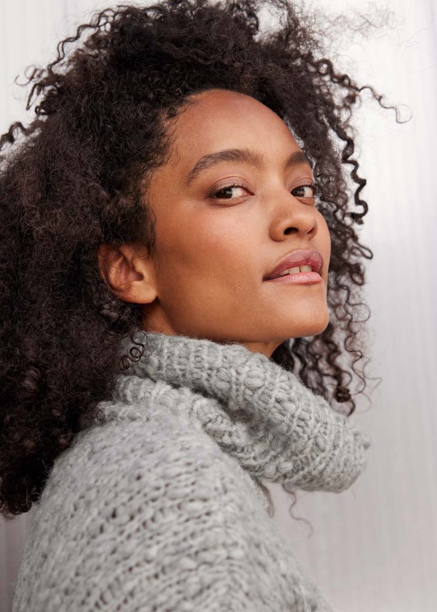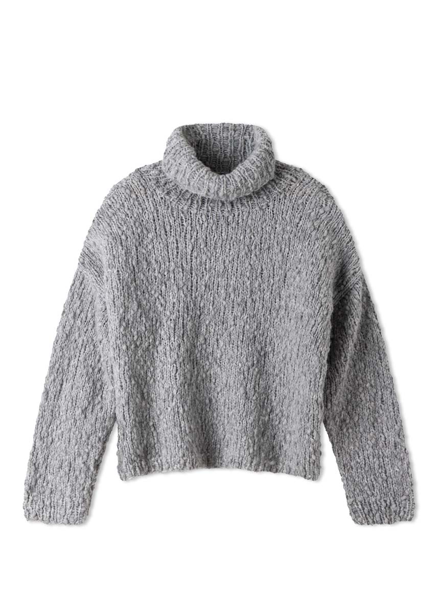 Gerade, glatt rechts gestrickte Teile und ein gerippter Rollkragen. Die Noppenstruktur kommt über das Garn (neu) aus einer Merino-Alpaka-Mischung. Ein Fashion-Piece für Einsteiger.