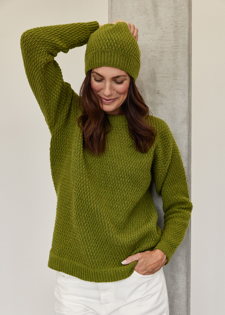 Lana Grossa Cashmere 16 Fine (80% Schurwolle (Merino), 10% Kaschmir, 10% Polyamid, Lauflänge 320 m/50 g), 550 (600 – 650) g Limette (Fb. 42); 1 Häkelnadel Nr. 3 und 3,5.