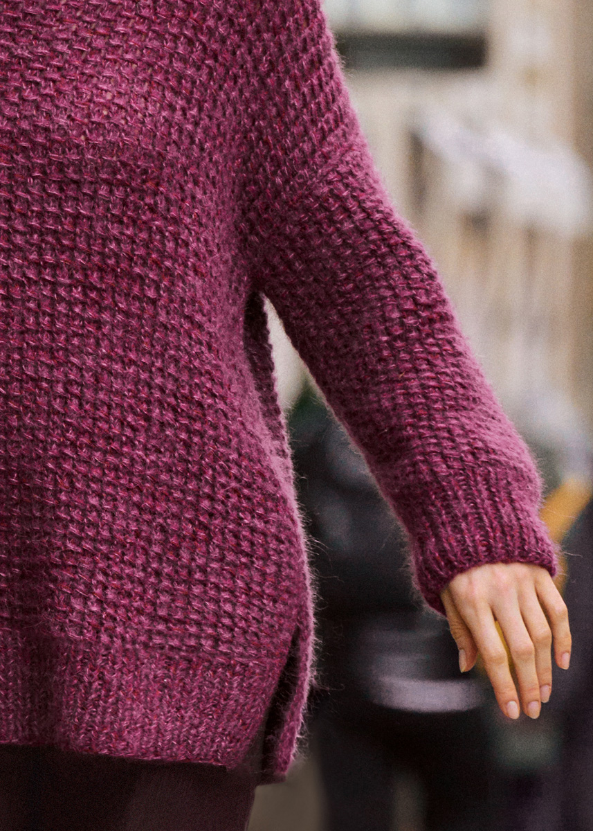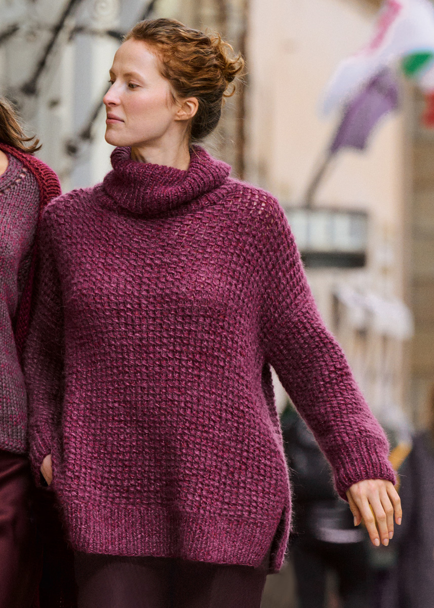 Der lockere Rollkragen-Sweater besteht aus einfachen Teilen und einem unkomplizierten Kästchenmuster mit Umschlägen und überzogenen Maschen. Das Modell wird stets mit 3fachem Faden gestrickt - je 2 Fäden Setasuri und 1 Faden Cashmere 16.