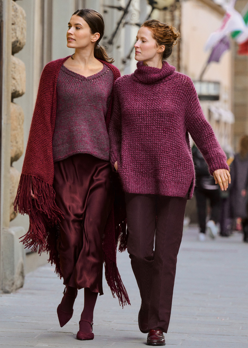 Lana Grossa-Qualität „Cashmere 16 Fine“ (80 % Schurwolle (Merino), 10 % Kaschmir, 10 % Polyamid, LL = ca 320 m/50 g): ca 100 (150 - 150 - 150) g Burgund (Fb 58); Lana Grossa-Qualität „Setasuri“ (69 % Alpaka (Suri), 31 % Seide, LL = ca 212 m/25 g): ca 125 (150 - 175 - 200) g Bordeaux (Fb 31); Stricknadeln Nr 7 und 8; 1 kurze Rundstricknadel Nr 7.