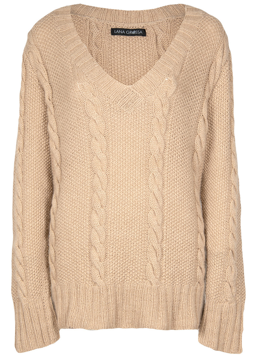 Lana Grossa Cashmere Puro (100% Kaschmir, 82 m/25 g), 425 (450 – 475 – 500) g Beige (Fb 4); Stricknadeln Nr. 4 und 5, 1 Rundstricknadel Nr. 4, 40 cm lang, 1 Zopfnadel.