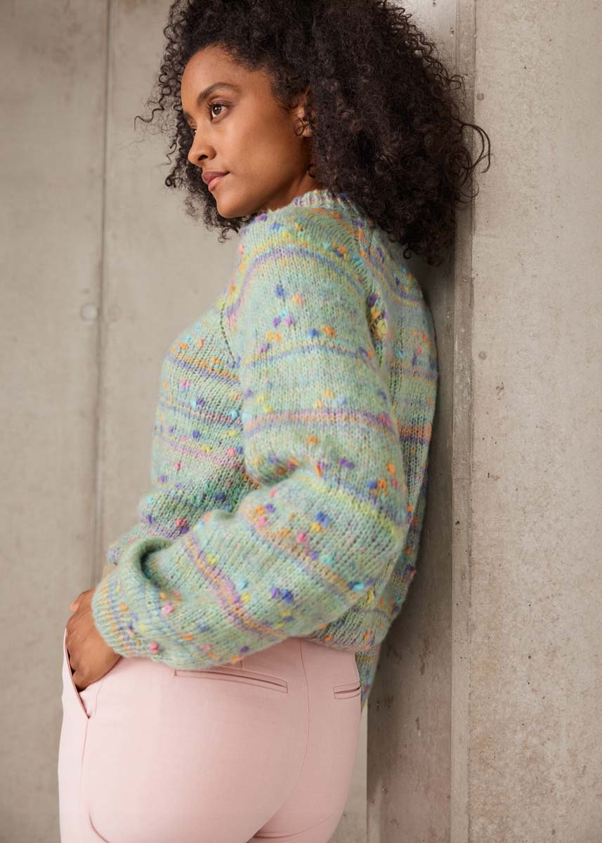 Eye-Candy: RAGLAN-PULLI aus einem neuen, bunt genoppten Effektgarn, das mit einer zuckersüßen Farbpalette bezaubert. Abgerundet wird das Modell von einer verkürzten Silhouette und femininen Ballonärmeln.