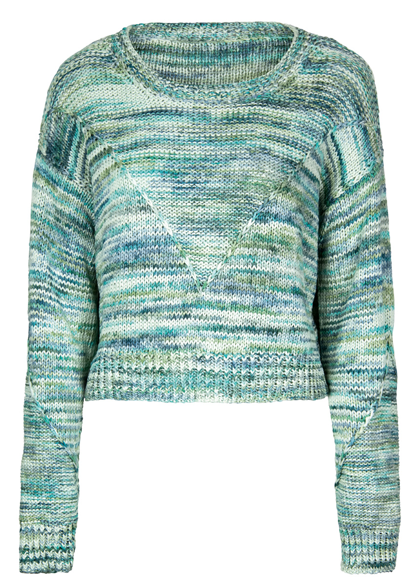 Lana Grossa „Certo Print“ (100% GOTS-Baumwolle; Lauflänge 115 m/50 g), 500 (600/700) g in Graugrün/Jade/Graublau/Natur (Fb 106); Stricknadeln Nr. 5 und 7, 1 Rundstricknadel Nr. 5 in 40 cm Länge.
