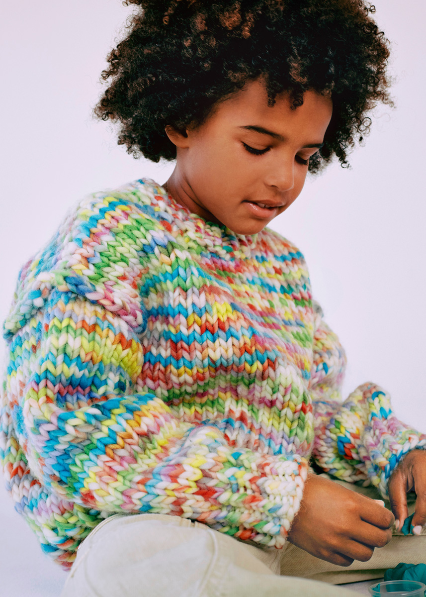 Lana Grossa Confetti (100% Schurwolle (Merino), Lauflänge 50 m/100 g), 600 (700 – 700) g Flieder/Blauviolett/Rost/Senf/Rohweiß/ Petrol (Fb. 6); je 1 Rundstricknadel Nr. 9, 40 und 60 cm lang, 1 Rundstricknadel Nr. 10, 40 und 80 cm lang und 1 Nadelspiel Nr. 9.