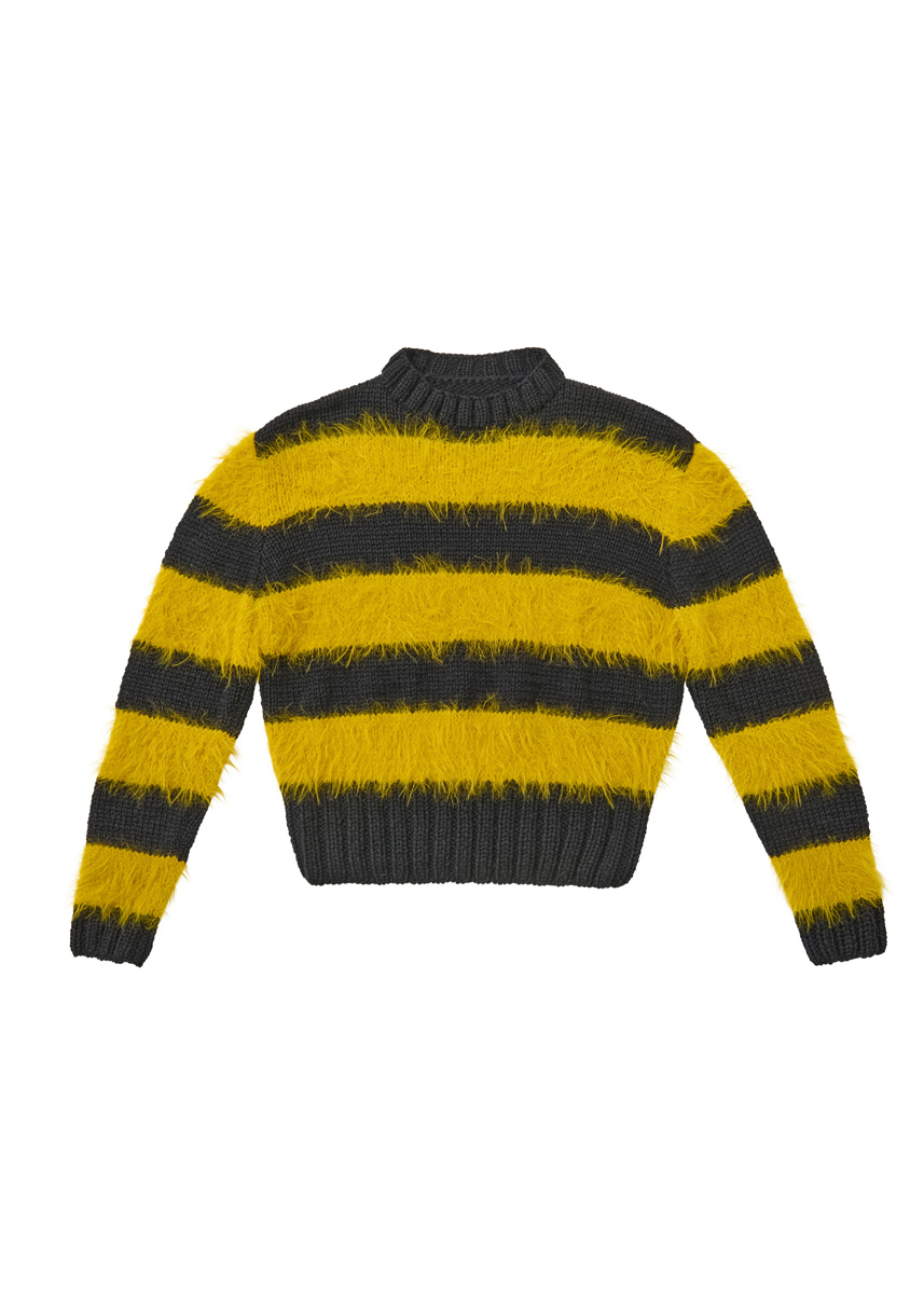 Der Pullover mit Puschelstreifen ist lässig geschnitten und macht sofort gute Laune.