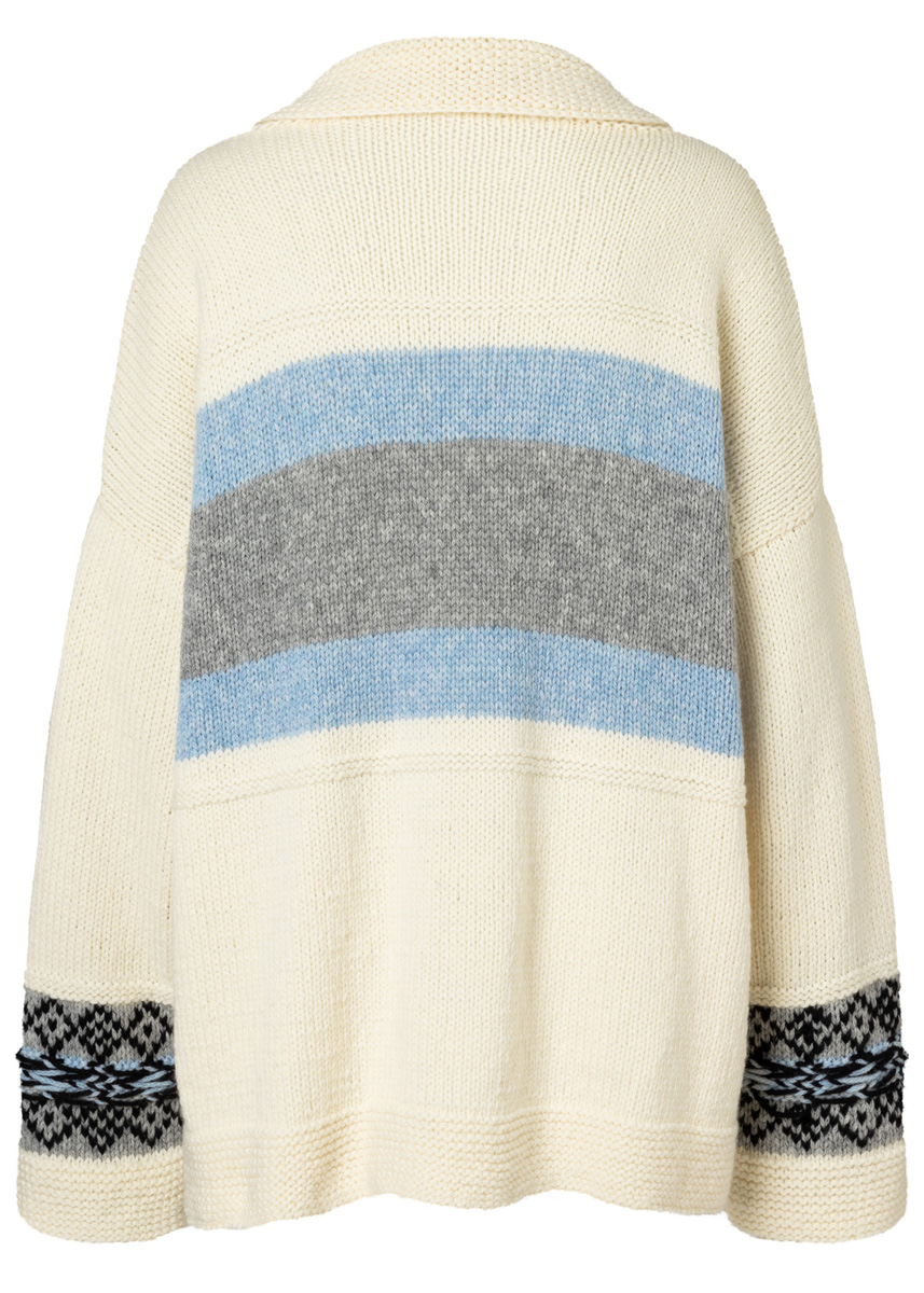 Lana Grossa Cool Merino (90% Schurwolle (Merino), 10% Polyamid, Lauflänge 150 m/50 g), 450 (500 – 550) g Weiß (Fb 15), 100 (150 – 150) g Hellblau (Fb 6), 100 (150 – 150) g Hellgrau (Fb 13) und 50 (100 – 100) g Schwarz (Fb 14); Stricknadeln Nr. 5,5 und 6, 1 Rundstricknadel Nr. 6, 40 cm lang.