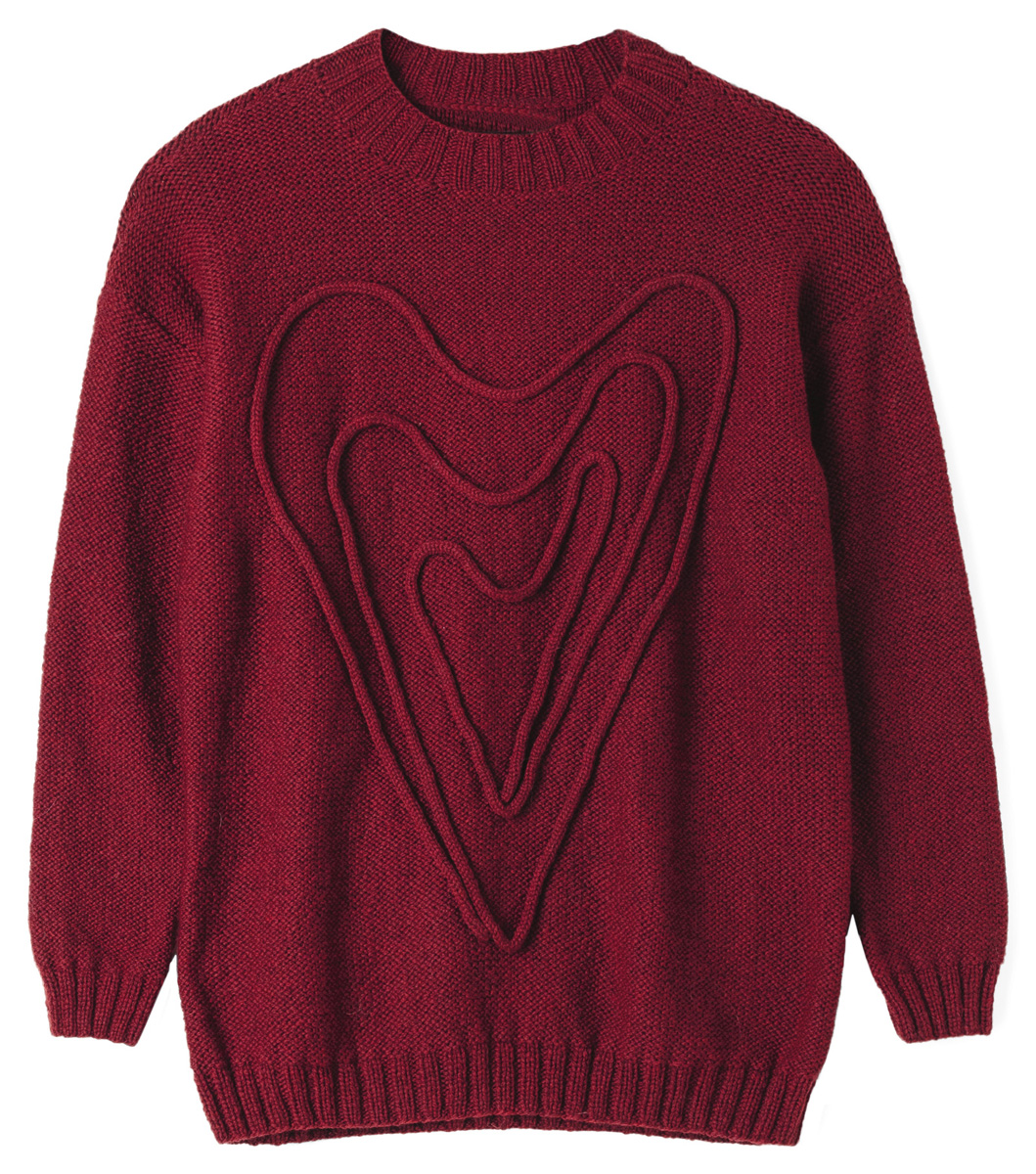 Lana Grossa Cool Merino (90% Schurwolle (Merino), 10% Polyamid, Lauflänge 150 m/50 g), 500 (550 – 600) g Dunkelrot (Fb 1); Stricknadeln Nr. 4 und 5, 1 Rundstricknadel Nr. 4, 40 cm lang, 1 Strickmühle von PRYM und Nähgarn in passender Farbe.