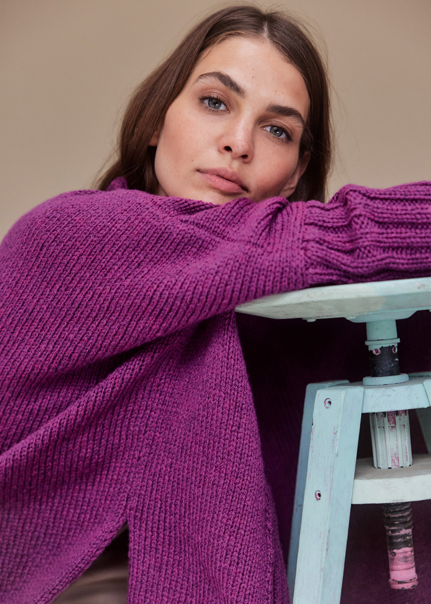 Lana Grossa-Qualität „Cool Merino“ (90 % Schurwolle (Merino), 10 % Polyamid, LL = ca 150 m/50 g): ca 450 (500 - 550 - 600) g Fuchsia (Fb 2); Stricknadeln Nr 6; 1 kurze Rundstricknadel Nr 6.