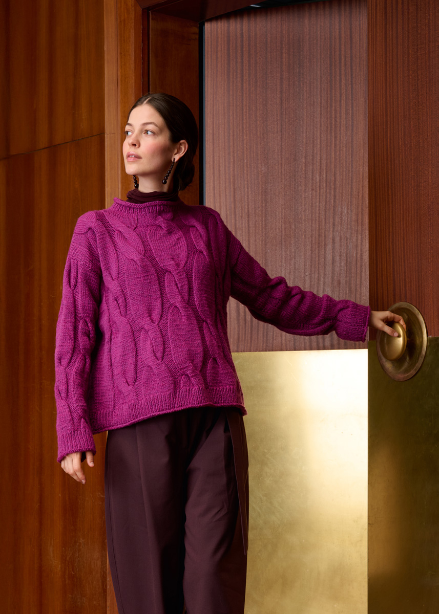 Lana Grossa Cool Merino (90% Schurwolle (Merino), 10% Polyamid, Lauflänge 150 m/50 g), 500 (550 – 600) g Fuchsia (Fb. 2); Stricknadeln Nr. 5 und 5,5, 1 Rundstricknadel Nr. 5, 40 cm lang, sowie 1 Zopfnadel.