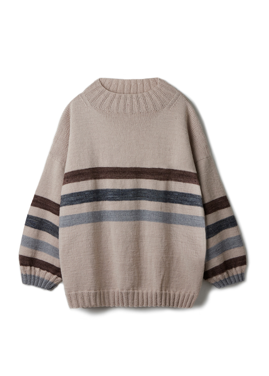 Lana Grossa Cool Wool (100% Schurwolle (Merino extrafine), LL = ca. 160 m/50 g), 450 (500 - 550 - 600) g in Perlbeige (Fb 2114). Cool Wool Vintage (100% Schurwolle (Merino extrafine), LL = ca. 160 m/50 g), je 50 g in Hellgrau (Fb 7369), Dunkelbraun (Fb 7384) und Dunkelgrau (Fb 7391). Je eine 50 cm und eine 80 cm lange Rundstrick-Nd Nr 3; eine 80 cm lange Rundstrick-Nd Nr 3,5. 3 Hilfs-Nd zum M stilllegen.