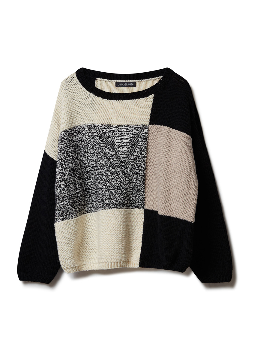 Lana Grossa Cool Wool (100% Schurwolle (Merino extrafein), Lauflänge 160 m/50 g), 150 (200 – 200 – 250) g Schwarz (Fb. 433), 150 (200 – 200 – 250) g Ecru (Fb. 432) und 50 (100 – 100 – 150) g Beige (Fb. 526) und Lana Grossa Ecopuno (72% Baumwolle, 17% Schurwolle (Merino), 11% Alpaka (Baby), Lauflänge 215 m/50 g), 150 (200 – 200 – 250) g Schwarz (Fb. 16), 150 (150 – 150 – 200) g Ecru (Fb. 46) und 50 (100 – 100 – 150) g Sandbeige (Fb. 64); Stricknadeln Nr. 4 und 5,5, sowie 1 Rundstricknadel Nr. 4, 40 cm lang.