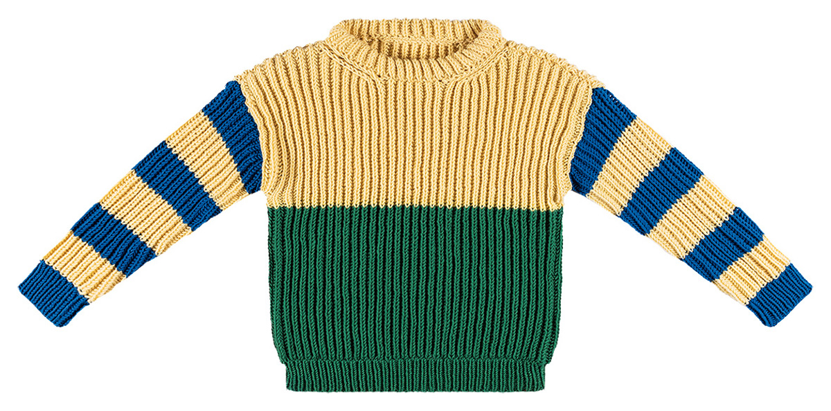 Lana Grossa Cool Wool (100% Schurwolle, Lauflänge 160 m/50 g), 200 (250 – 250) g Vanille (Fb 411), 150 (200 – 200) g Grün (Fb 2017) und 100 (150 – 150) g Tintenblau (Fb 2071); Stricknadeln Nr. 3,5 und 4, 1 Rundstricknadel Nr. 4, 40 cm lang.