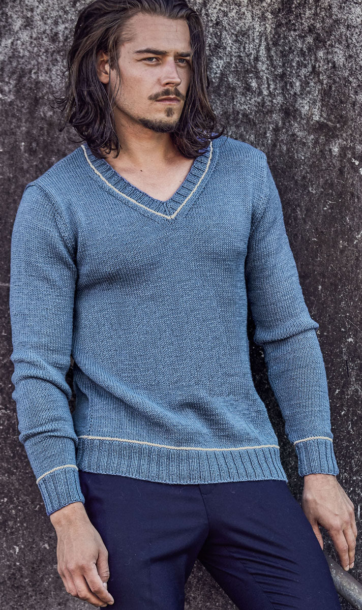 Neue Saison, neuer Look: der jeansfarbene V-Pulli punktet mit kontrastfarbenen Streifen an allen Bündchen.