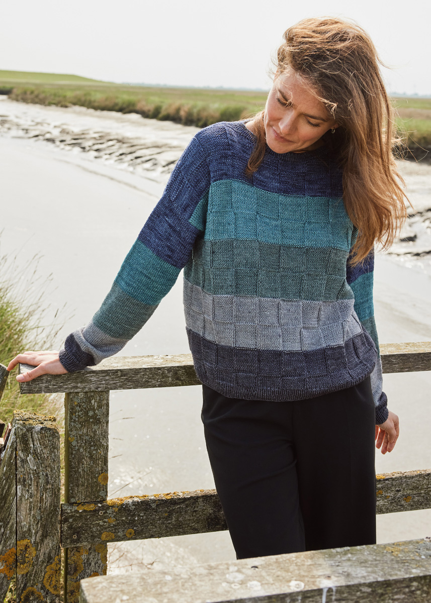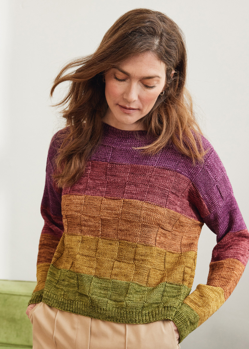 Variante B: Lana Grossa-Qualität „Cool Wool Vintage“ 100% Schurwolle (Merino extrafine), LL = ca. 160 m/50 g); je 100 (100 - 150 - 150) g Oliv (Fb 7361), Senf (Fb 7362), Camel (Fb 7363), Burgund (Fb 7364) und Pflaume (Fb 7365); Stricknadeln Nr. 3 und 3,5, eine kurze Rundstricknadel Nr. 3