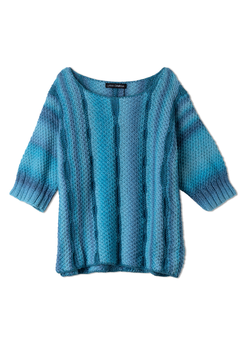 Lana Grossa Corallo (70% Baumwolle (Bio), 30% Schurwolle (Merino), Lauflänge 210 m/100 g), 400 (400 - 500) g in Helltürkis/Türkis/Jeans (Fb 7), Lana Grossa Filo Lurex (94% Baumwolle, 6% Polyester, Lauflänge 145 m/50 g), 50 (100 - 100) g in Petrol (Fb 10) und Lana Grossa Landlust Kidmohair (70% Mohair (Superkid), 30% Baumwolle, Lauflänge 225 m/25 g), 25 (50 - 50) g in Taubenblau (Fb 9); 1 Rundstricknadel Nr 4,5, 100 cm lang, 1 Häkelnadel Nr 3,5.