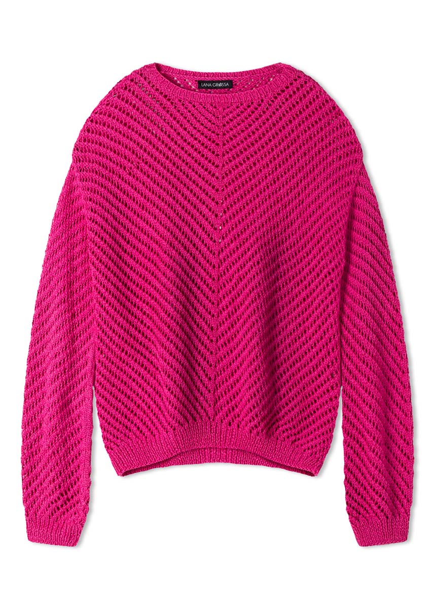 Hier wurde ein Lochmuster diagonal inszeniert, was, zusammen mit der Oversize-Form, cool und zeitgemäß wirkt. Wichtig: Verlorene Maschen sind schwer zu retten, darum langsam und sorgfältig stricken.