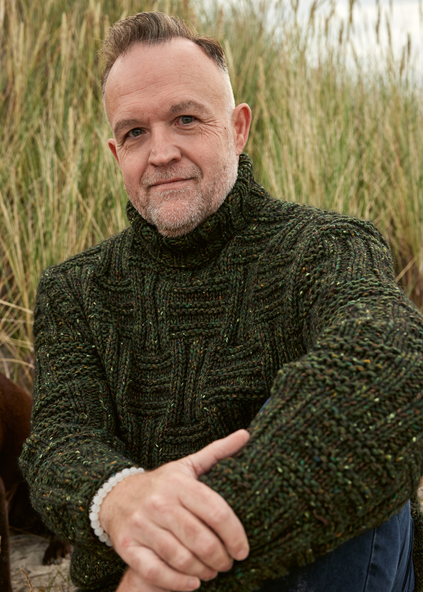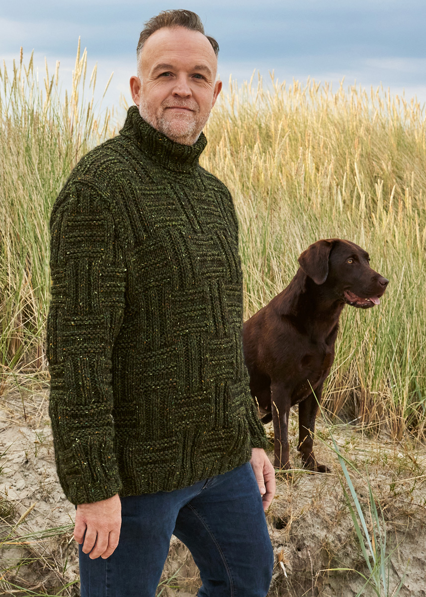 Lana Grossa Country Tweed (100% Schurwolle, Lauflänge 90 m/50 g), 650 (700 – 750 – 750) g Dunkelgrün meliert (Fb 7) und Lana Grossa Puno Due (63% Baumwolle, 37% Alpaka (Baby), Lauflänge 210 m/50 g), 250 (300 – 350 – 350) g Nougat/Schwarzbraun (Fb 6); Stricknadeln Nr. 6 und 7, sowie 1 Rundstricknadel Nr. 6.