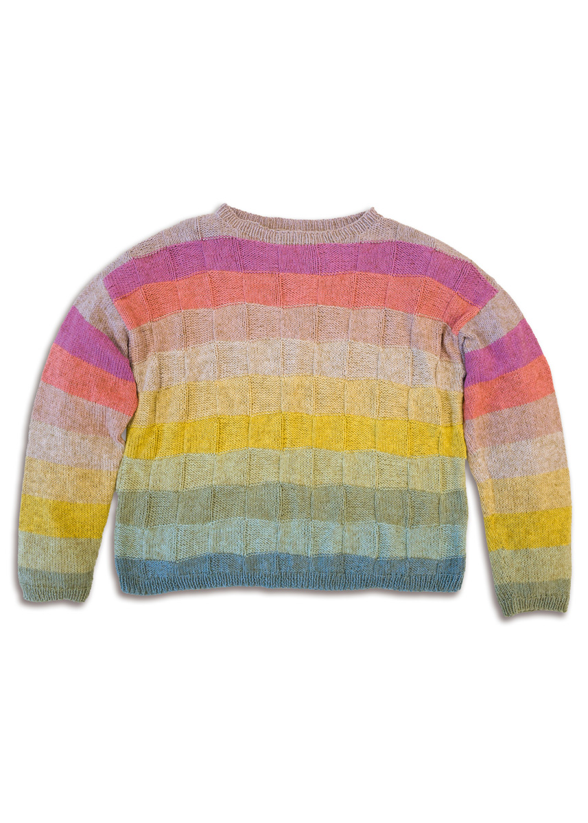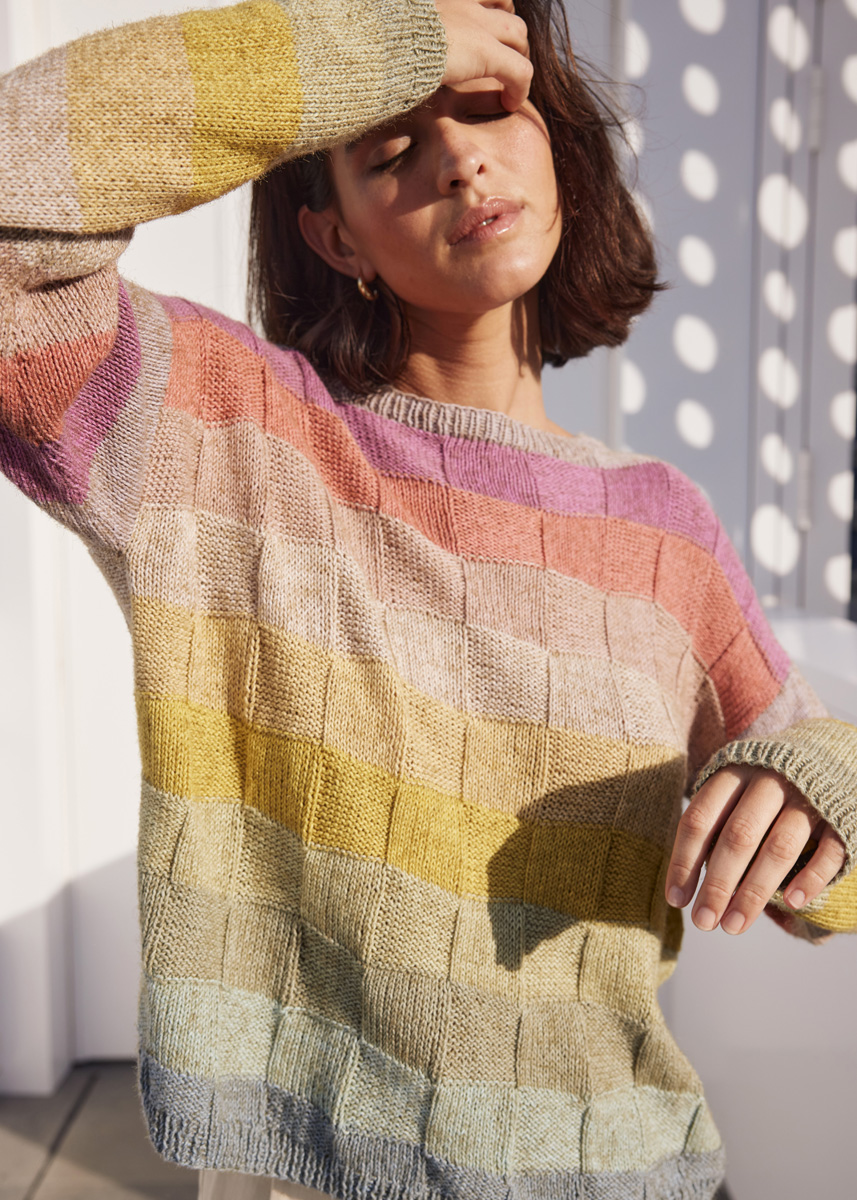 Wie ein Farbverlauf wirkt das Streifenmuster für den lockeren Sweater in elf frischen Farben. Die effektvolle Schachbrettstruktur wird durch ein neues, meliertes Garn abgerundet, das angenehm weich und flauschig ist.