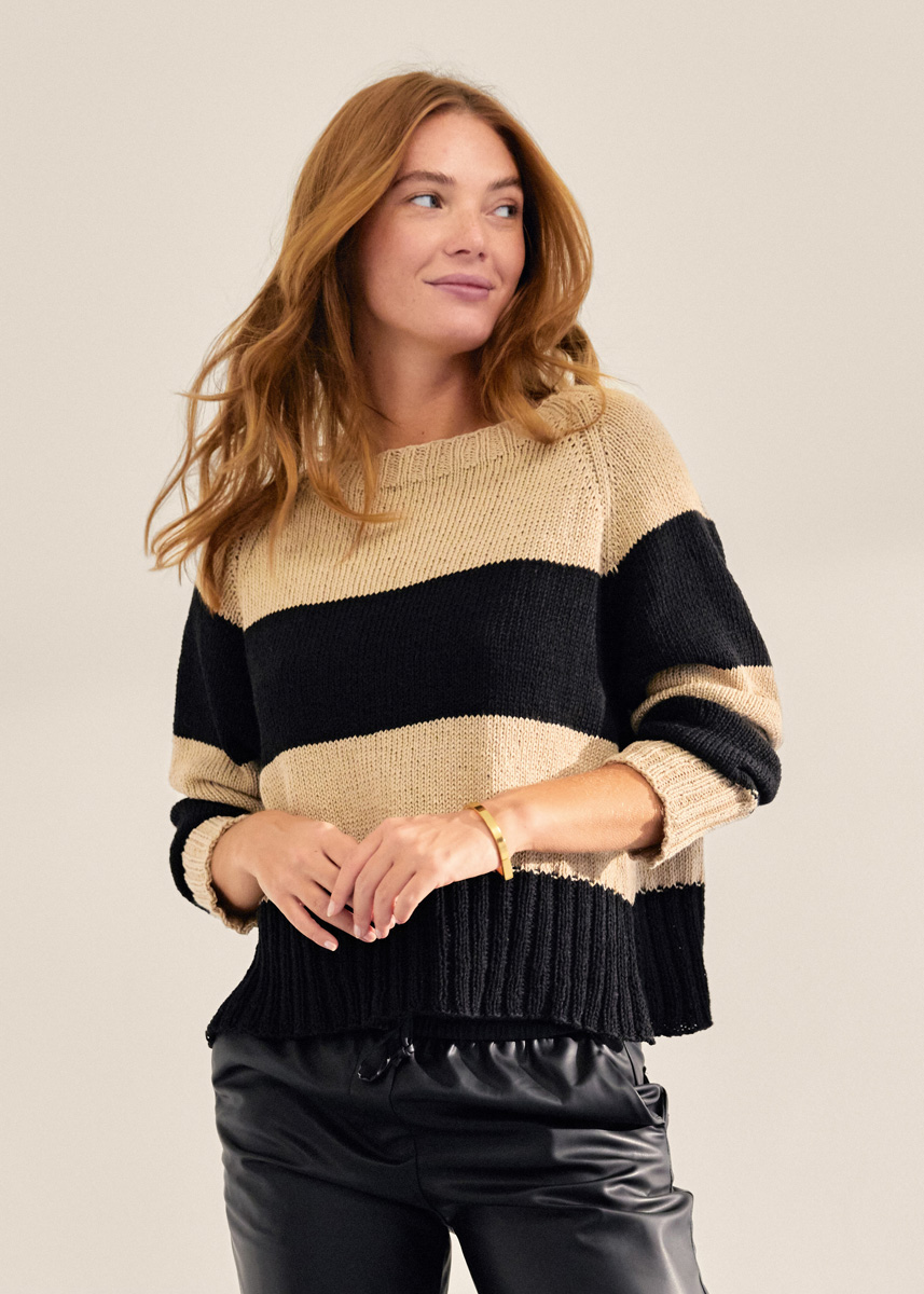 Das Dilemma mit klassisch gestrickten Streifen- Pullovern: Die Muster von Ärmeln und Rumpf landen selten auf gleicher Höhe. Wer, wie hier, top-down arbeitet, bekommt das Problem schwerelos in den Griff. Obendrein entfallen die Nähte. Praktisch, oder?