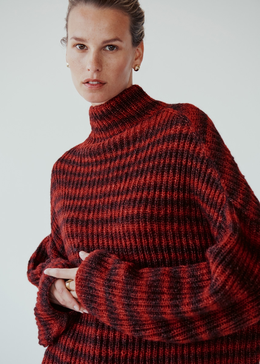 Markant an diesem Pullover ist der Kontrast zwischen der ultraweiten Form und dem schmalen Turtleneck. Verlaufsgarn und das Patentmuster betonen seine sportliche Optik.