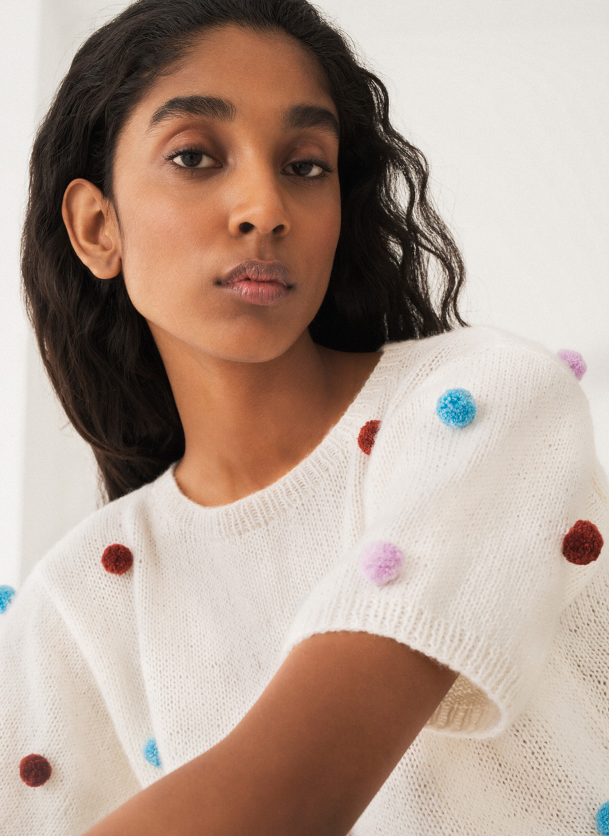 Lana Grossa Ecopuno (72 % Baumwolle, 17 % Schurwolle Merino, 11 % Baby Alpaca, Lauflänge 215 m/50 g), 200 (250 – 300) g Weiß (Fb 26), 50 g Braunrot (Fb 31), 50 g Türkisblau (Fb 29) und 50 g Lila (Fb 30); Stricknadeln Nr. 3 und 4, 1 Rundstricknadel Nr. 3, 40 cm lang, 1 Pomponmaker von Lana Grossa.