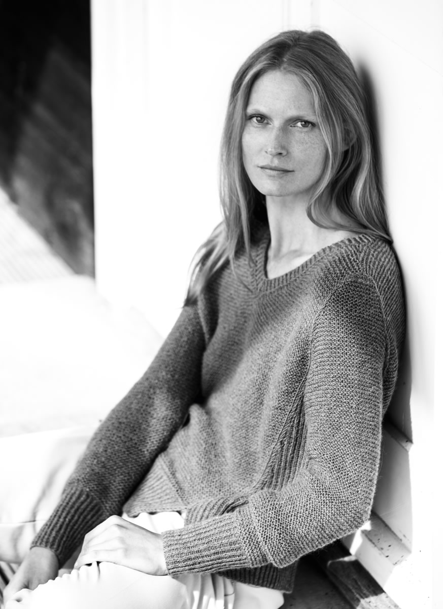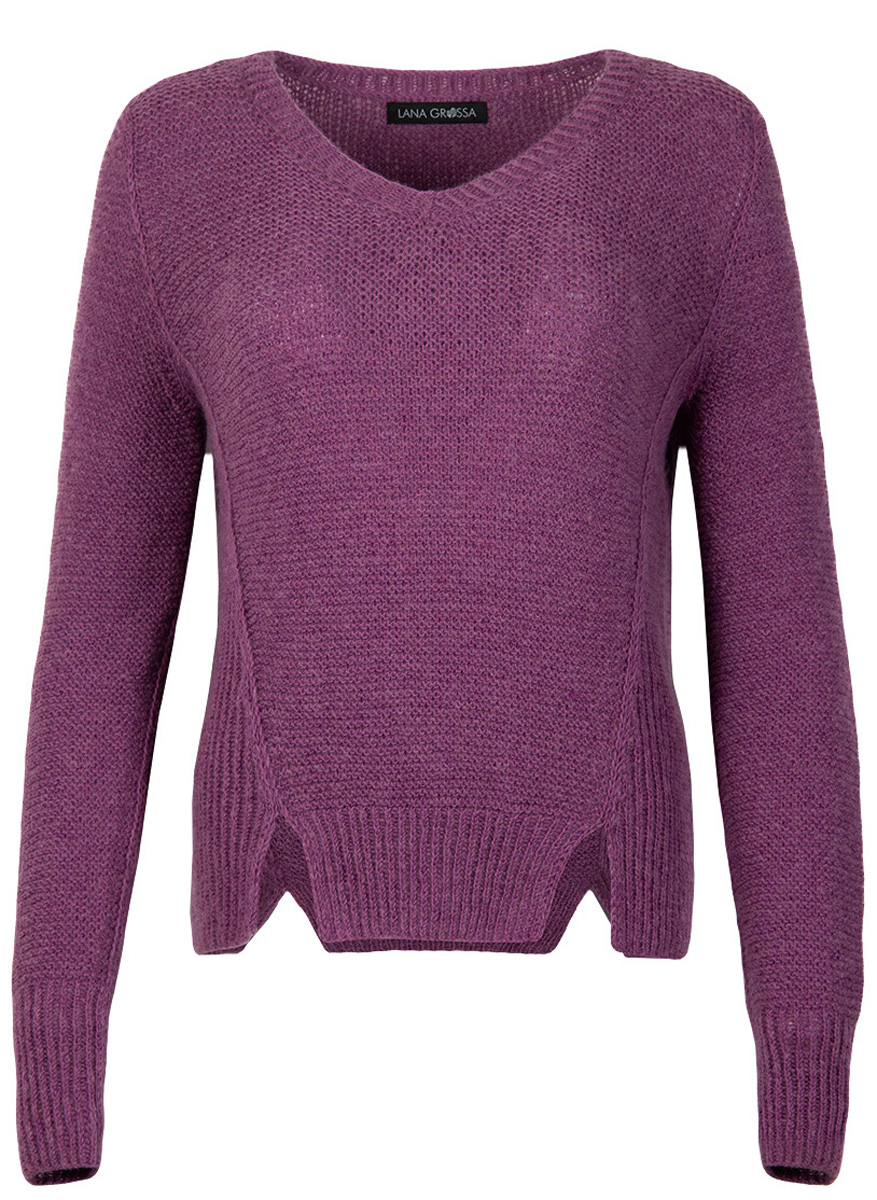 Lana Grossa Ecopuno (72% Baumwolle, 17% Schurwolle Merino, 11% Baby Alpaca, Lauflänge 215 m/50 g), 350 (400 – 450) g Beere (Fb 40); Stricknadeln Nr. 3 und 4, 1 Rundstricknadel Nr. 3, 40 cm lang.
