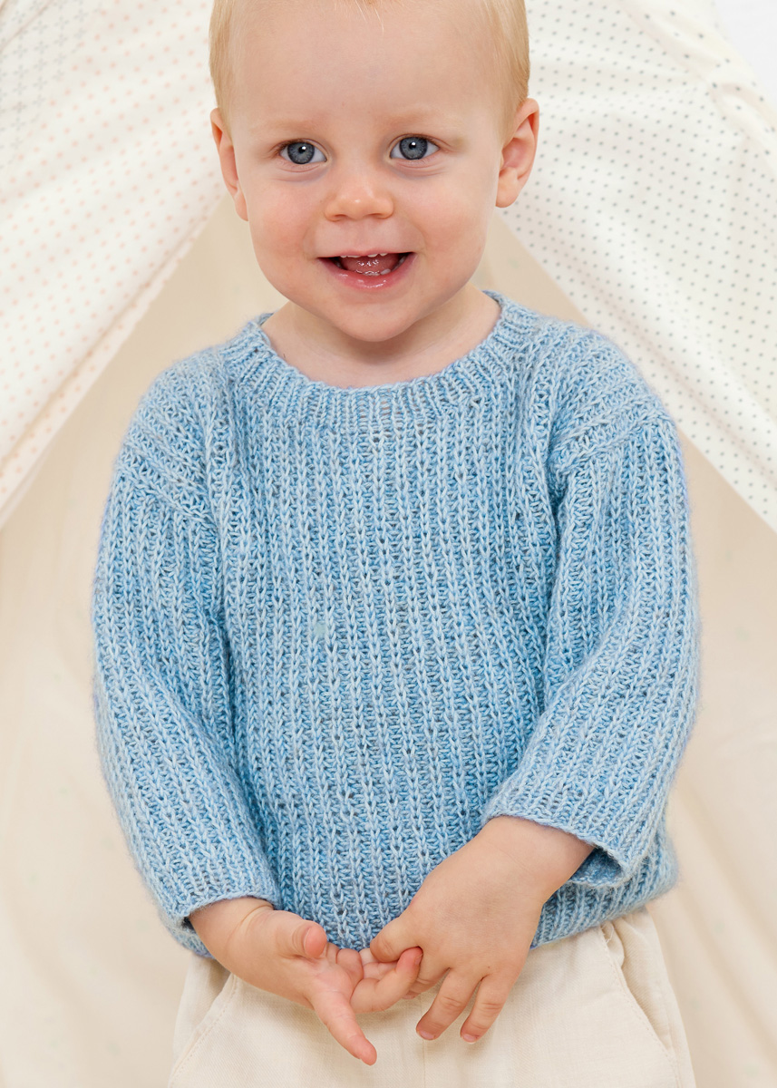 Lana Grossa Ecopuno (72 % Baumwolle, 17 % Schurwolle (Merino), 11 % Alpaka (Baby), Lauflänge = 215 m/50 g): 100 (100/150) g helles Jeansblau (Fb 75); Stricknadeln Nr. 3,5; eine 40 cm lange Rundstricknadel Nr. 4.