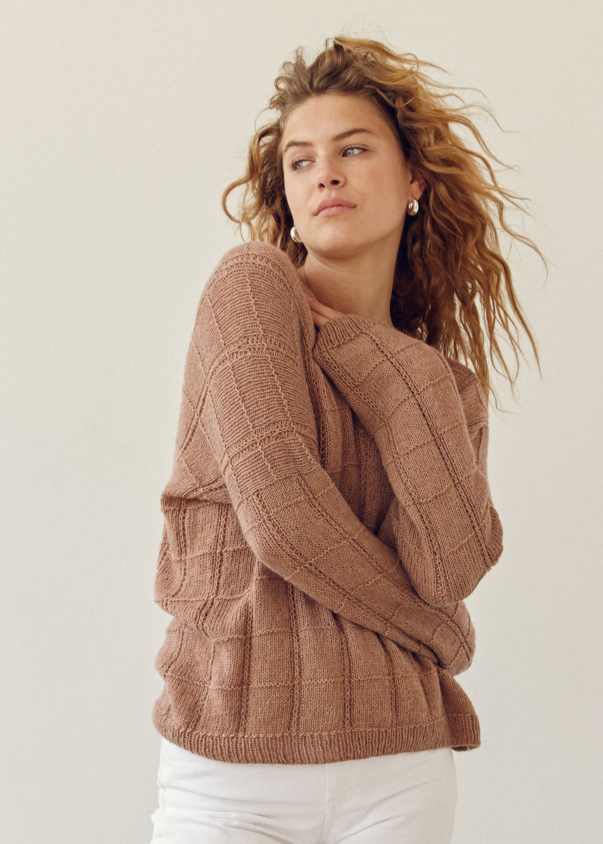 Lana Grossa Ecopuno (72% Baumwolle, 17% Schurwolle (Merino), 11% Alpaka (Baby), Lauflänge 215 m/50 g), 350 (400 – 450) g Camel (Fb. 32); je 1 Rundstricknadel Nr. 3 und 4, 40 und 80 cm lang, sowie ein zusätzliches Seil einer Rundstricknadel für den offenen Maschenanschlag.