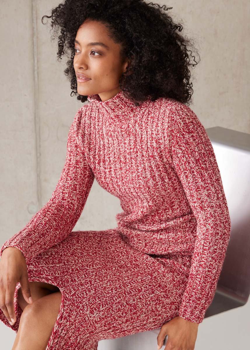 Cosy meets classy: Das Mouliné-Set aus Pulli und Midirock wird doppelfädig und in Rippen gestrickt. Der TURTLENECK-SWEATER hat eine taillierte Passform und kleine Armkugeln. Dazu der ROCK mit asymmetrisch platziertem Schlitz.