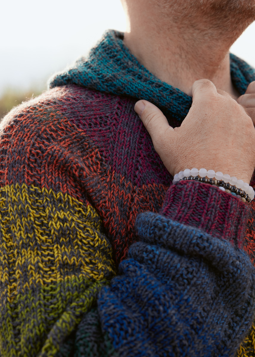 Lana Grossa Ecopuno (72% Baumwolle, 17% Schurwolle (Merino), 11% Alpaka (Baby), Lauflänge 215 m/50 g), 300 (350 – 400 – 400) g Dunkelgrau (Fb 15) und Lana Grossa Merino Superiore (100% Schurwolle (Merino extrafine), Lauflänge 180 m/50 g), 100 g Dunkelpetrol (Fb 19), 50 (100 – 100 – 100) g Bordeaux (Fb 27), 50 (100 – 100 – 100) g Terrakotta (Fb 11), 50 (100 – 100 – 100) g Gelb (Fb 10), 50 (100 – 10 – 100) g Blattgrün (Fb 14), 50 (100 – 100 – 100) g Dunkelgrün (Fb 17), 50 (100 – 100 - 100) g Dunkelblau (Fb 20) und 50 (100 – 100 – 100) g Jeansblau (Fb 22); je 1 Rundstricknadel Nr. 4, 40 und 80 cm lang, je 1 Rundstricknadel Nr. 5, 40, 60 und 80 cm lang, 8 Maschenmarkierer.