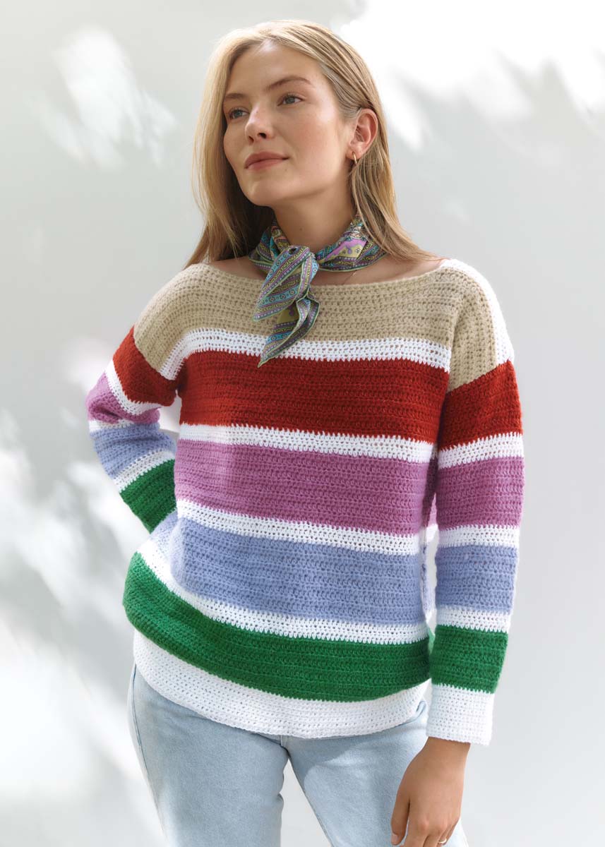 Bunte Blockstreifen, aufgelockert mit viel frischem Weiß: Jawoll, Gehäkeltes kann auch sportlich