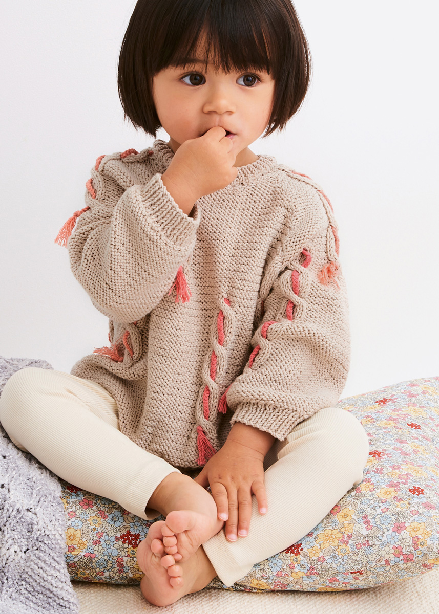 Lana Grossa Elastico (96 % Baumwolle, 4 % Polyester (Elité), Lauflänge 160 m/50 g) 100 (150/150/200) g Beige (Fb 97), 50 g Kardinalrot (Fb 132) und 50 g Lachsorange (Fb 162); Stricknadeln Nr. 4 und 4,5, eine 40 cm lange Rundstricknadel Nr. 4; vier Druckknöpfe mit 10 mm Ø.