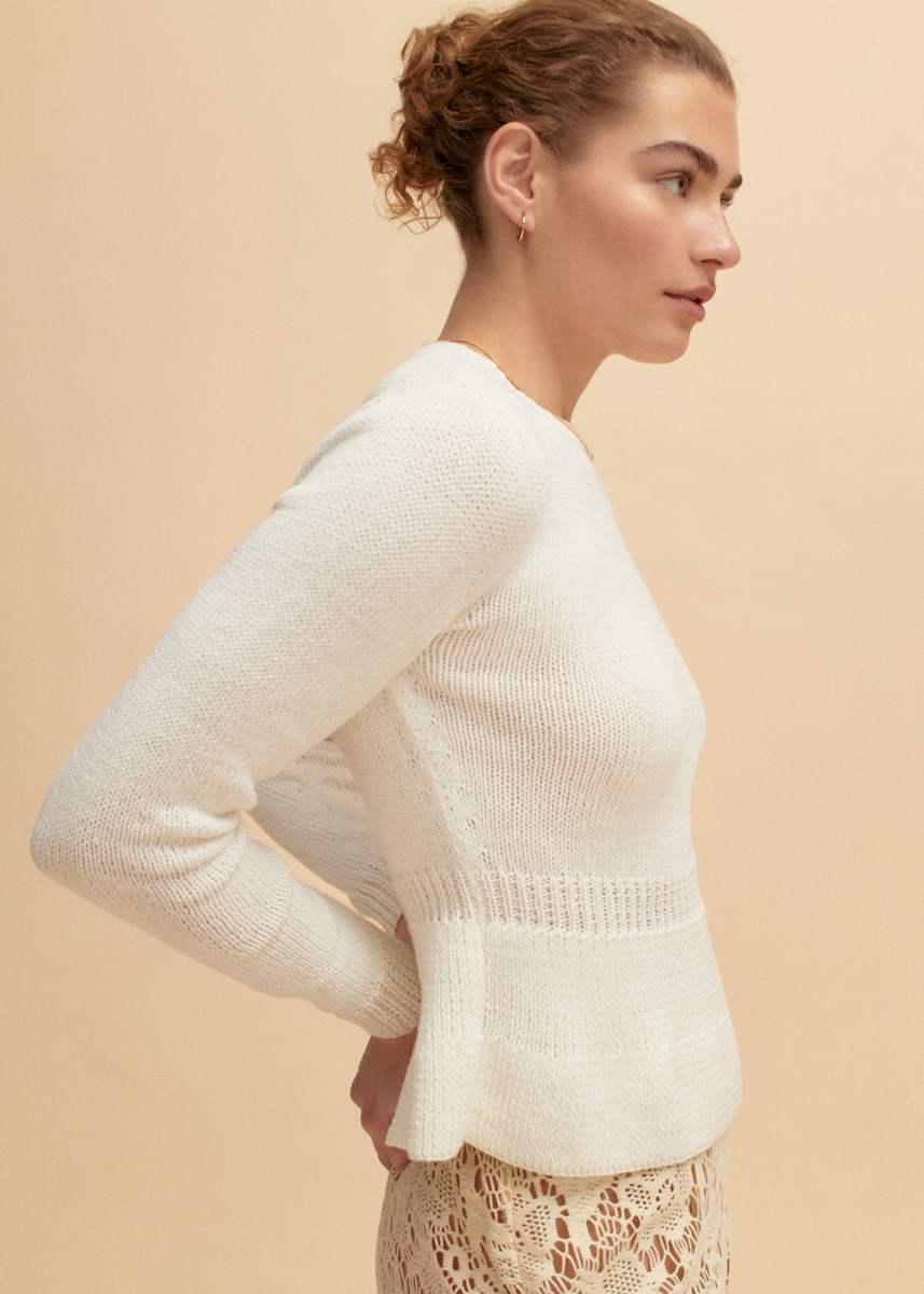 Lana Grossa Elastico (96% Baumwolle, 4% Polyester (Elité), Lauflänge 160 m/50 g), 400 (450 – 500) g Ecru (Fb 36); Stricknadeln Nr. 3 und 4, 1 Rundstricknadel Nr. 3, 40 cm lang.
