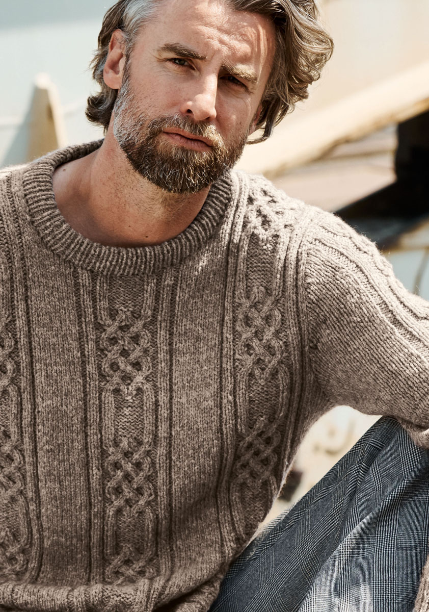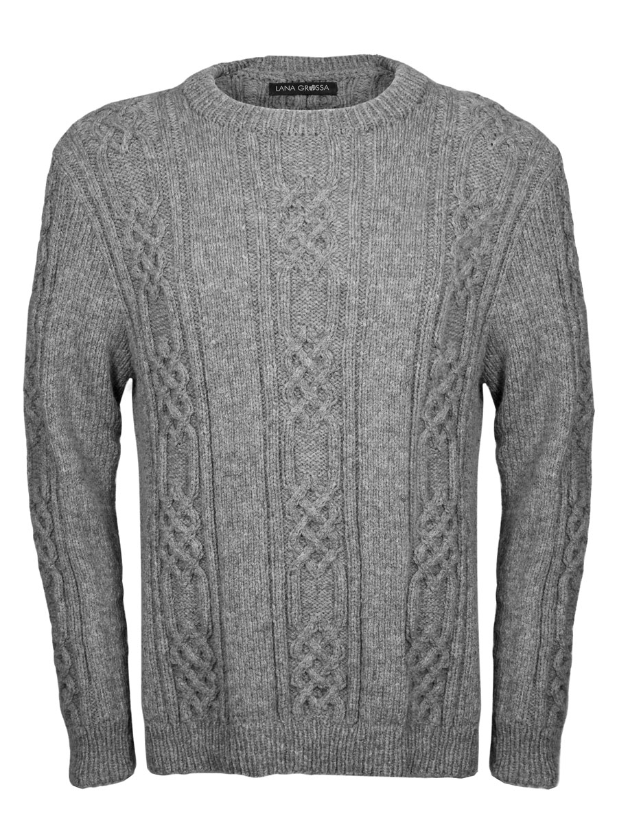 Lana Grossa Fatto (62% Schurwolle Merino extrafein, 26% Mohair Super Kid, 12% Polyacryl, Lauflänge 175 m/50 g), 500 (550 – 600) g Graubeige (Fb 8); Stricknadeln Nr. 5 und 6, 1 Rundstricknadel Nr. 5,5, 40 cm lang, 1 Zopfnadel