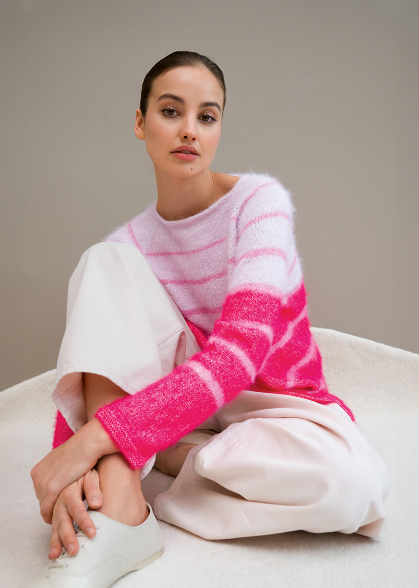 Lana Grossa Finito (73 % Baumwolle, 27 % Polyamid, LL 150 m/50 g), 150 (150 – 200 – 200) g Fliederrosa/ Creme (Fb 17), 100 (100 – 150 – 150) g Pastellpink/Creme (Fb 18), 250 (250 – 300 – 300) g Bonbonrosa/Creme (Fb 19); Rundstricknadel Nr 4, Länge 60-100 cm; 8 Maschenmarkierer.