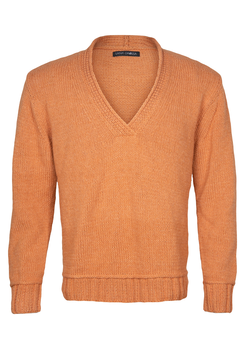 Leicht, warm, wunderschön: Kaschmirmix in gebranntem Orange sorgt bei diesem Pulli für Klasse. Die subtilen Details (tiefer V-Neck und Saumblenden mit Bieseneffekt) setzen noch eins drauf.