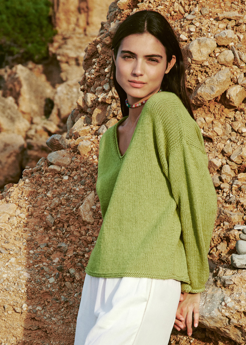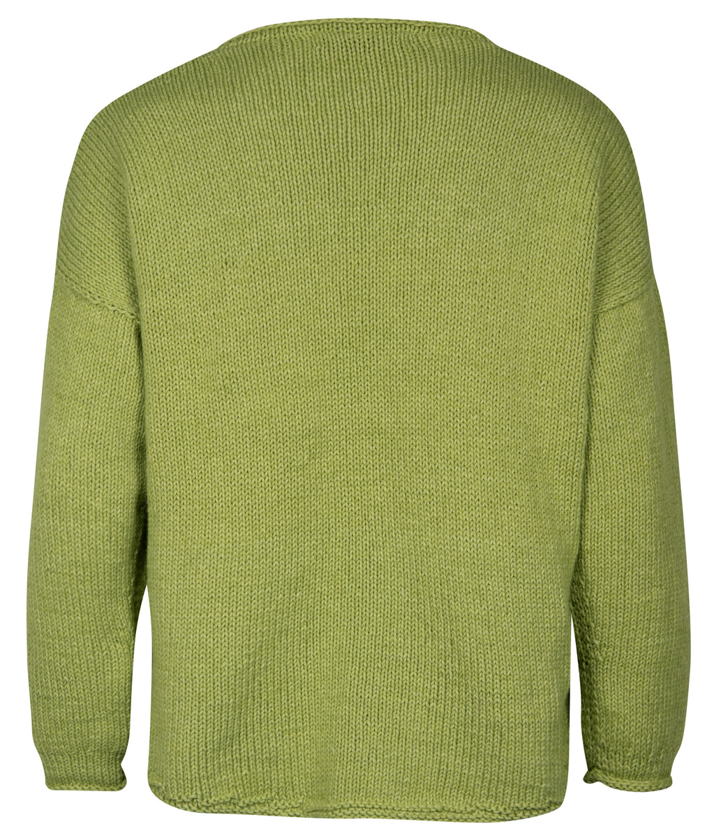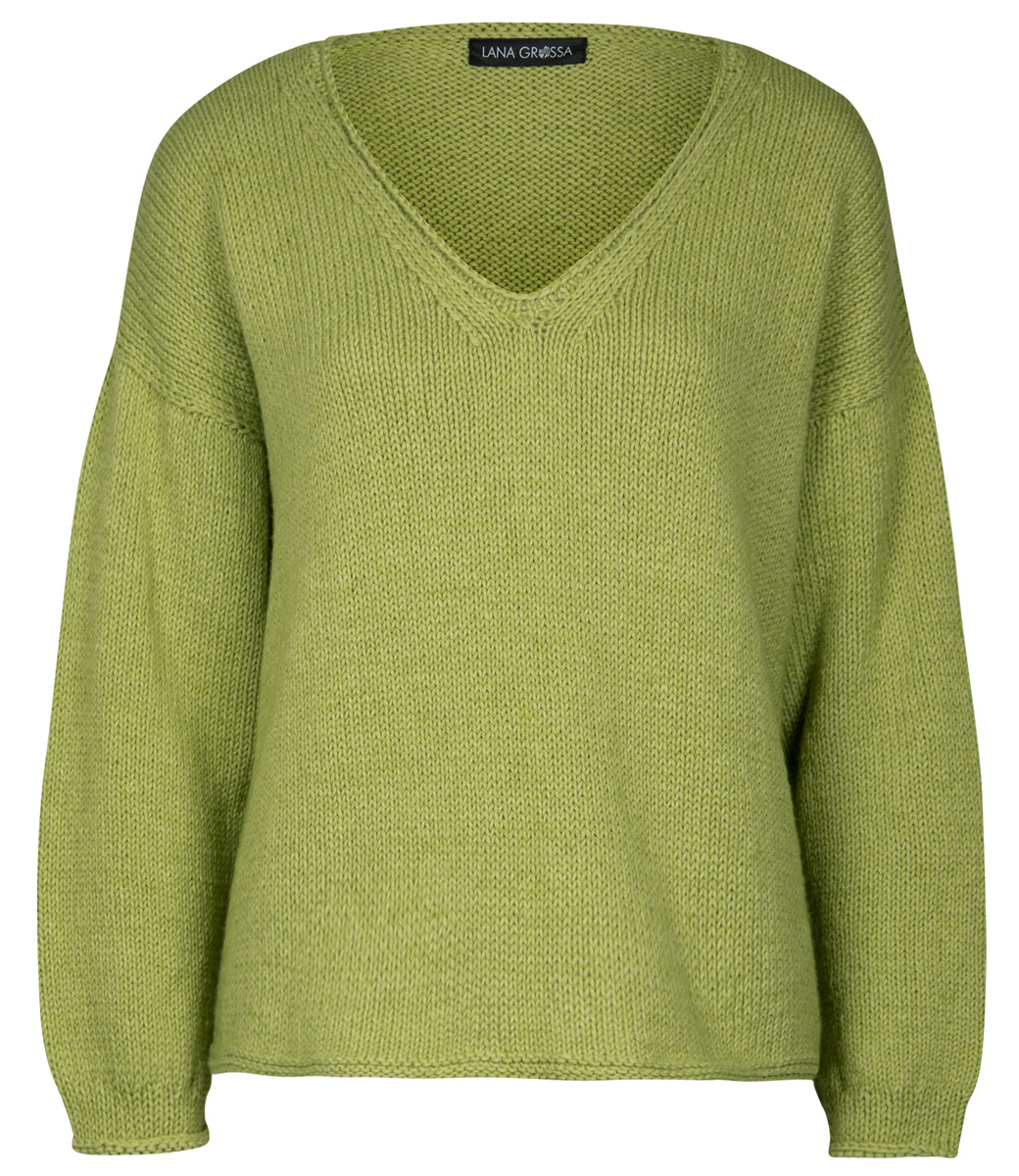 Der weite V-Neck Pulli in Helloliv hat eine gerade Form mit kraus rechts gestricktem Saumabschluss und Rollrand am Ausschnitt. Schulterschrägen sorgen für einen guten Sitz.