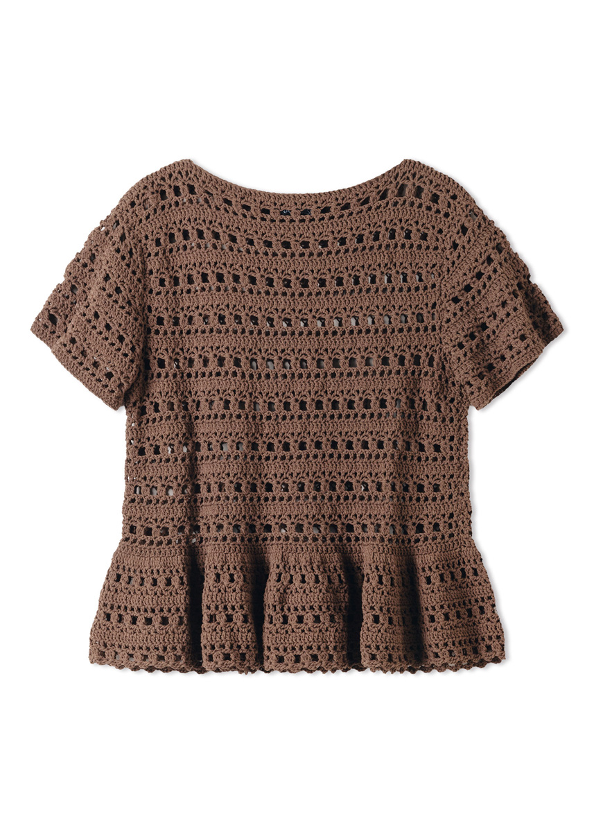 Trendfarbe Dunkelbraun taucht diesen Pullover in ein warmes, magisches Licht. Feminines Finale: das voluminöse Schößchen, das erst zum Schluss angehäkelt wird.