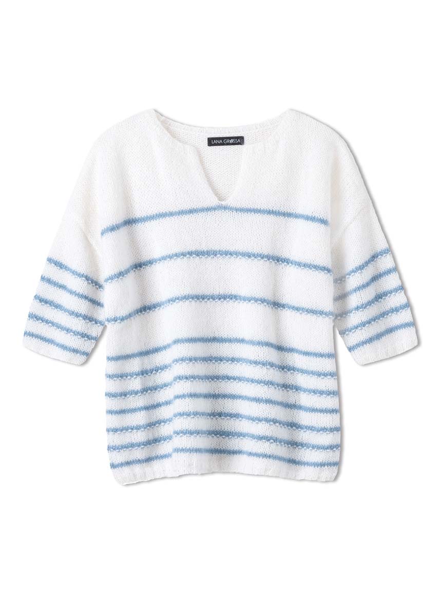 Lana Grossa-Qualität „Ecopuno” (72 % Baumwolle, 17 % Schurwolle (Merino), 11 % (Baby) Alpaka, LL = ca. 215 m/50 g): ca. 200 (250 – 300) g Weiß (Fb. 26) und ca. 50 (100 – 100) g Hellblau (Fb. 13) und Lana Grossa-Qualität „Silkhair” (70 % Mohair (Superkid), 30 % Seide, LL = ca. 210 m/25 g): ca. 100 (125 – 150) g Weiß (Fb. 117) und ca. 25 (50 – 50) g Rauchblau (Fb. 202); Stricknadeln Nr. 5 und 5,5, 1 Rundstricknadel Nr. 5, 60 cm lang.