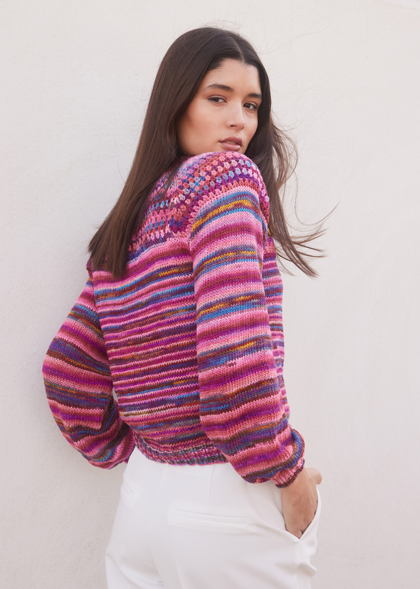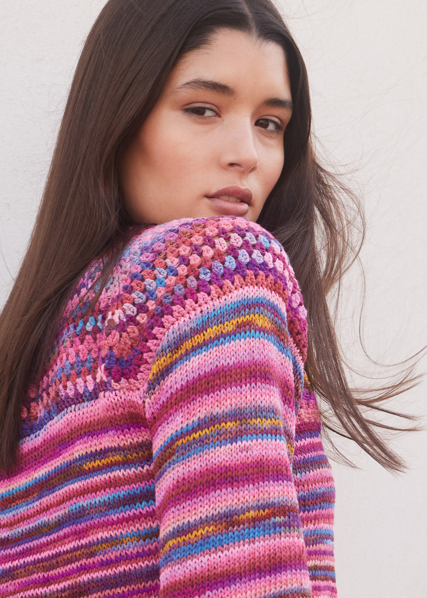 Lana Grossa-Qualität „Gomitolo Arco“ (52 % Baumwolle, 48 % Polyacryl, LL = ca 260 m/100 g): 4 (5 - 5 - 6) Knäuel = ca 400 (500 - 500 - 600) g Bordeaux/ Pink/Rosa/Blau/Violett/Gelb/Oliv/Türkis (Fb 178); kurze und lange Rundstricknadel Nr 3,5 und 4; 1 Nadelspiel Nr 3,5; Häkelnadel Nr 4.