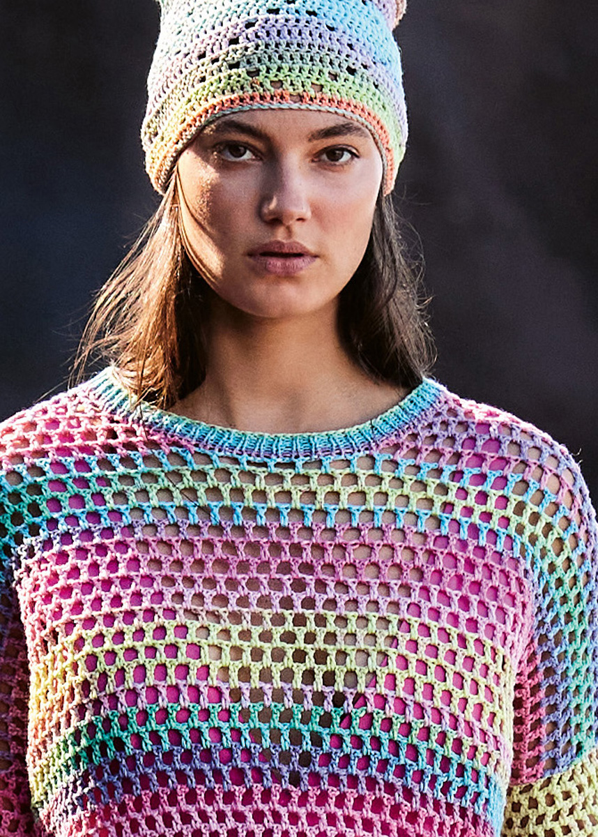 Lana Grossa-Qualität „Gomitolo Selezione 2“ (75 % Baumwolle, 25 % Viskose, LL = ca. 260 m/100 g): ca. 400 g Jade/Türkis/Zwetschge/Pink/Rosa/Altrosa/Hellgrün (Fb 2003); Stricknadeln Nr 3,5; Häkelnadel Nr 4; 1 kurze Rundstricknadel Nr 3,5.