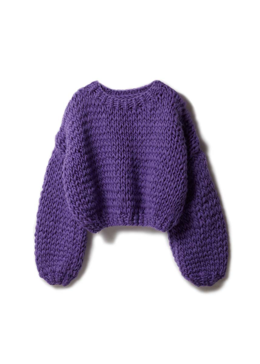 Lana Grossa-Qualität „Confetti” (100 % Schurwolle (Merino), LL = ca. 50 m/100 g): ca. 800 (900 – 1000) g Violett (Fb. 104); Stricknadeln Nr. 10, 1 Rundstricknadel Nr. 10, 60 cm lang.