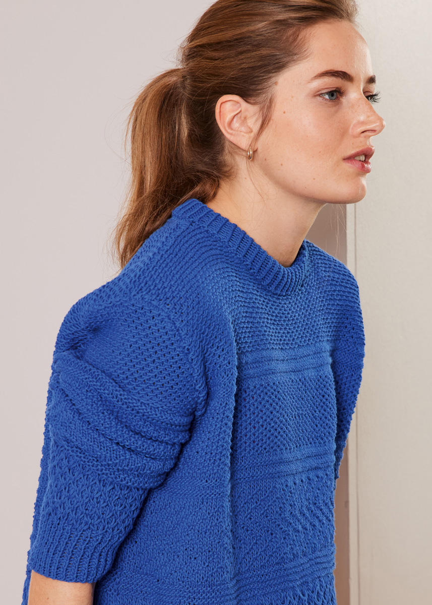 Anleihen aus den 50ern (rund eingesetzte Ärmel, halsnaher Ausschnitt, klassischer Mustermix) und dazu klirrendes Blau: ein Retro- Sweater mit coolem Twist.
